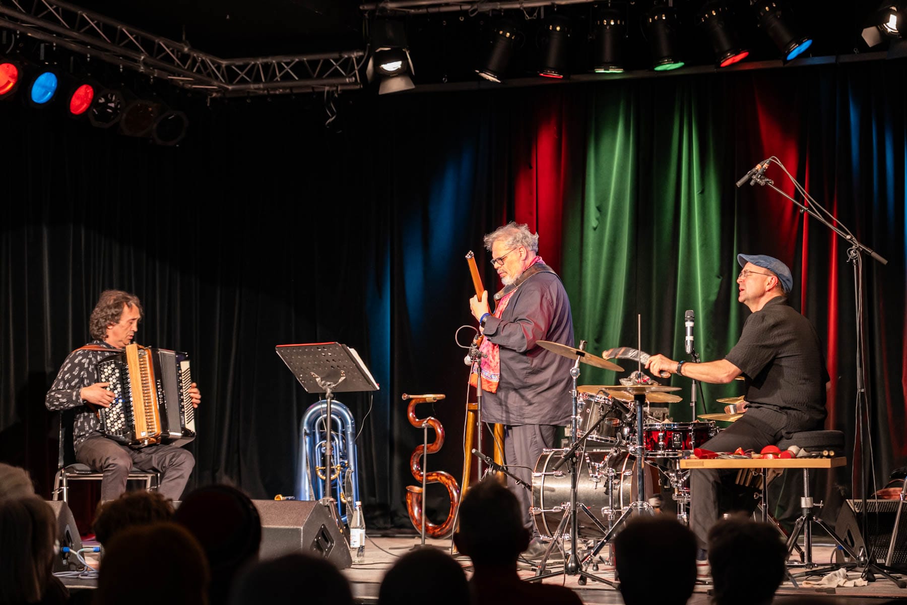 Drei Virtuosen, die auch an und über die Grenzen gehen, was die Spieltechniken und Ausdrucksformen mit ihren Instrumenten anbelangt. Biondini – Godard – Niggli steuern eine Seelenmusik an, voller Energie, Poesie und auch feinem Witz. Ihre Kompositionen dienen als ideale Sprungbretter für die lustvollen Geschichtenerzähler, die diese drei Improvisatoren sind.